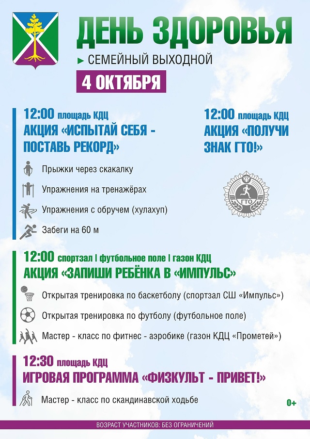 Прими участие в "Дне здоровья"- получи знак ГТО Культурно - досуговый центр "Прометей" и спортивная школа "Импульс" приглашают провести выходной день с пользой, радостью, удовольствием всей семьёй! ПРИХОДИТЕ, МЫ ВАС ЖДЁМ! |